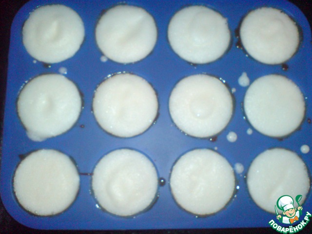 Берём противень, на него ставим силиконовую форму, полученную смесь разливаем по формочкам. Заливаем кипяток в противень, чтобы вода покрыла больше половины формы.