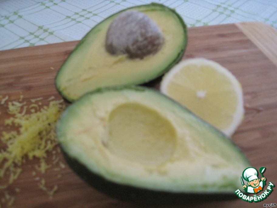 Разрезаем авокадо вдоль и, поворачивая, разделяем на две половинки. Удаляем косточку. Вынимаем мякоть.