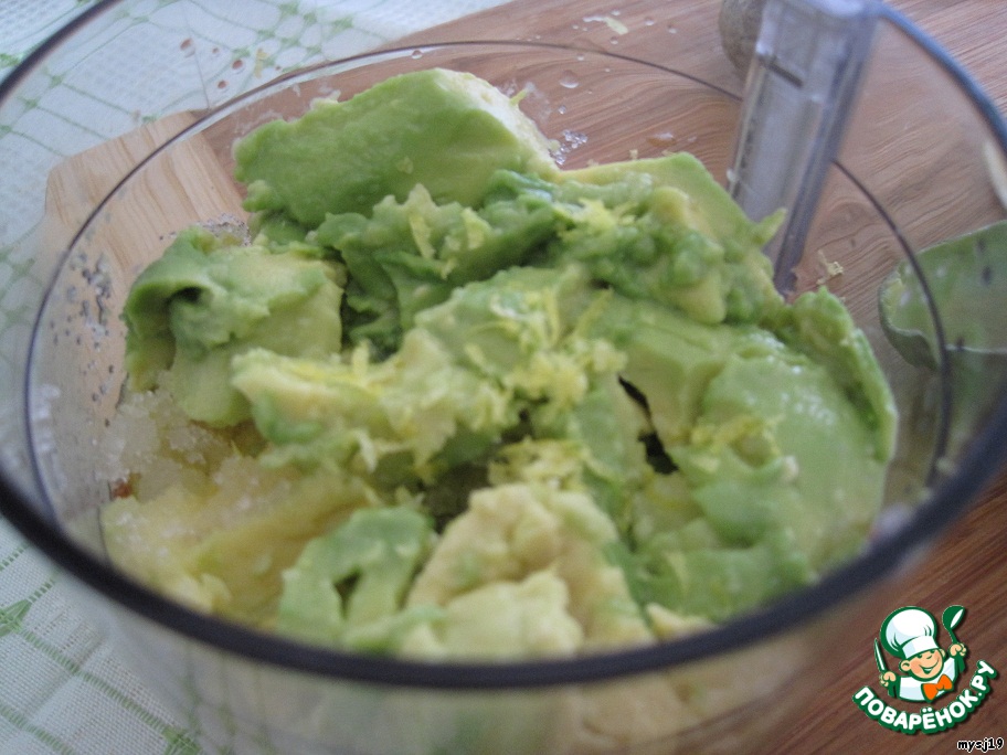 Нарезать мякоть авокадо, поместить в блендер. Добавить сок лимона или лайма, сахарный песок, сметану и цедру. Взбить в процессоре до однородной массы.