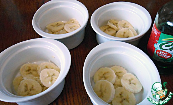 Банан порезать тонкими дольками, уложить на дно невысоких керамических формочек одинарным слоем.