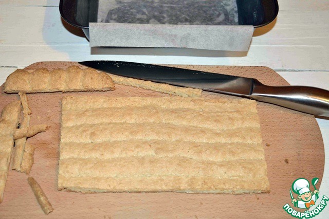 Готовый бисквит полность остужаем и обрезаем под размер нашей формы.