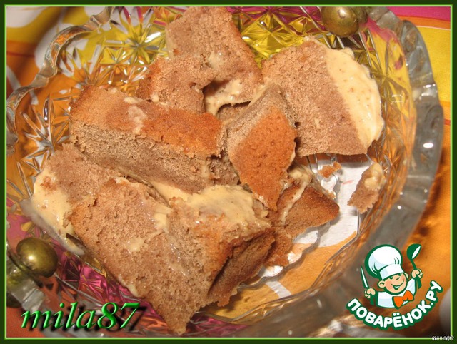 В вазы или креманки произвольно ломаем бисквит, заранее пропитанный сиропом (я слегка пропитала вишневым компотом).
