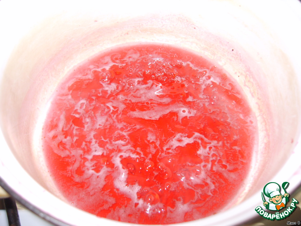 Другую половину залить 100 мл воды, довести до кипения, отвар процедить и отправить обратно в кастрюльку. Добавить 50 гр сахара и пакетик ванильного. Варить, помешивая, 10 минут. Получится соус, этакая малиновая карамель. Остудить.