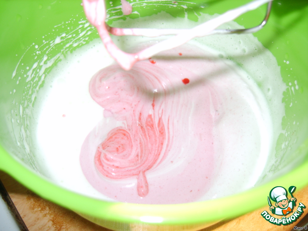 Белки взбить в течение 1 минуты, добавить 100 гр сахара, взбить до устойчивых пиков. Добавить протертую малину, еще раз взбить.