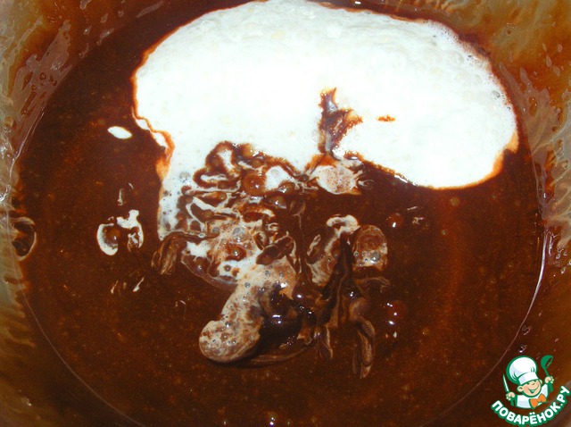 100 гр. сливок взбить венчиком и также порциями вмешать в желтково-шоколадную массу.