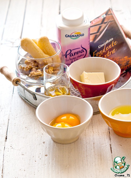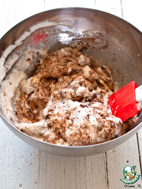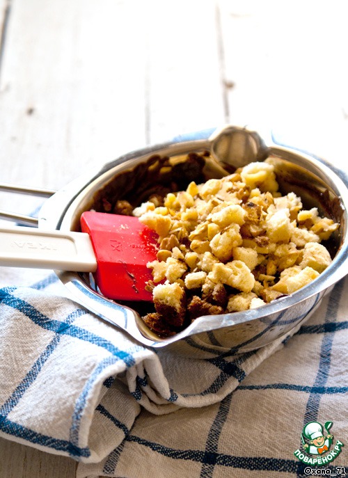 В шоколадную массу добавить раскрошенное печенье, оставшийся коньяк, крепкий кофе и порубленные орехи. Хорошо размешать.