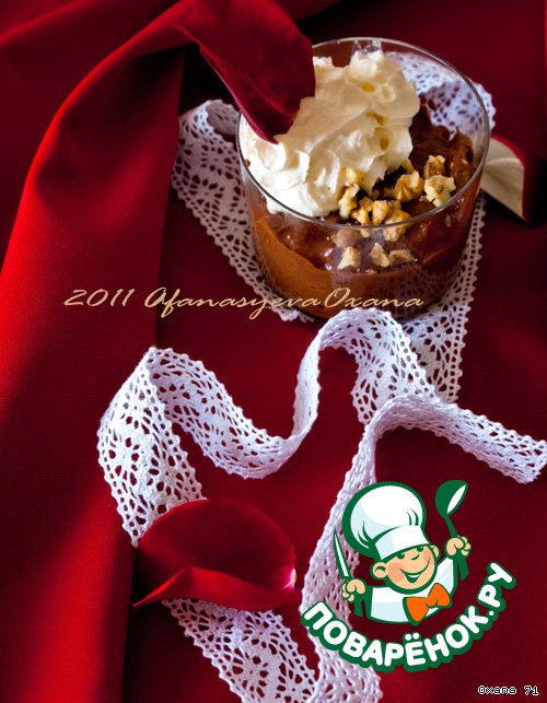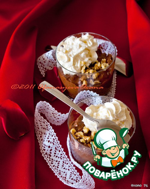Выложить в два стаканчика (не высокие) и поставить в холодильник на минимум 4 часа. Перед подачей украсить взбитыми сливками и грецким орехом.