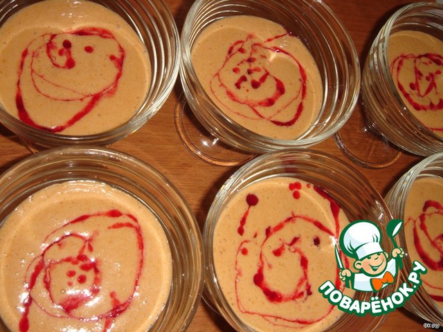 Последним слоем мусс. Был идея сделать мусс с легкими красными разводами. Как оказалось, старания были напрасны, желе опустилось на дно, не оставив разводов :-)