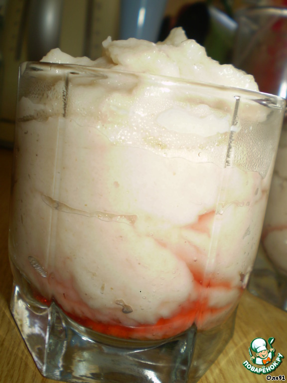 Аккуратно по стенкам нашего бокала или креманки выливаем клубничный сироп (совсем чуть-чуть, для красоты)