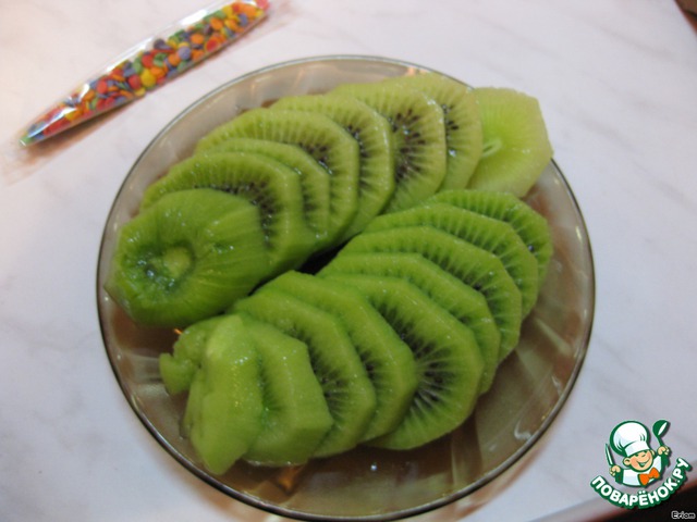 Раскладываем мусс в порционные креманки и, имитируя хвойную веточку, укладываем киви сверху.