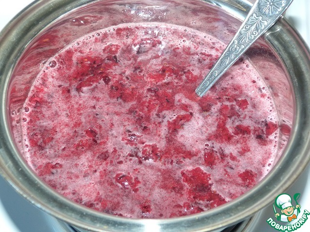 Переложить ягодное "пюре" в кастрюлю, залить водой. Поставить на плиту.