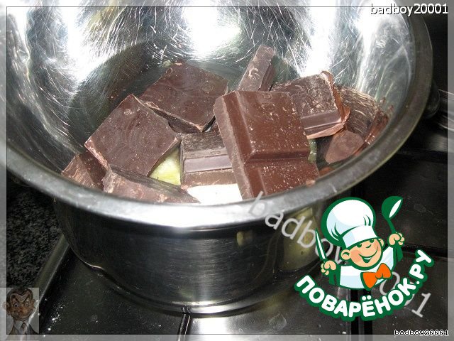 Когда желтки были освобождены от пут капитализма (опять эта политэкономия в голову лезет, вместо вкусных вещей), ну конечно от белков, взять кастрюльку и, налив воды, поставить на огонь. И на водяной бане, в мисочке с добавкой масла, начать растапливать шоколад. Так как микроволновые печки широко шагнули в нашу жизнь, то это можно сделать и в ней, конечно в подходящей посуде.