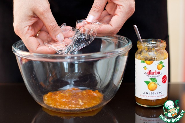Пластину желатина замочить в небольшом количестве холодной воды. Абрикосовый конфитюр слегка подогреть в микро и смешать его с лимонным соком и желатином до полного его растворения.