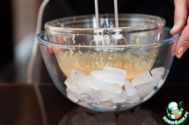 В большую миску положить лед, вставить в нее миску с муссом и взбивать миксером, пока смесь не начнет густеть.