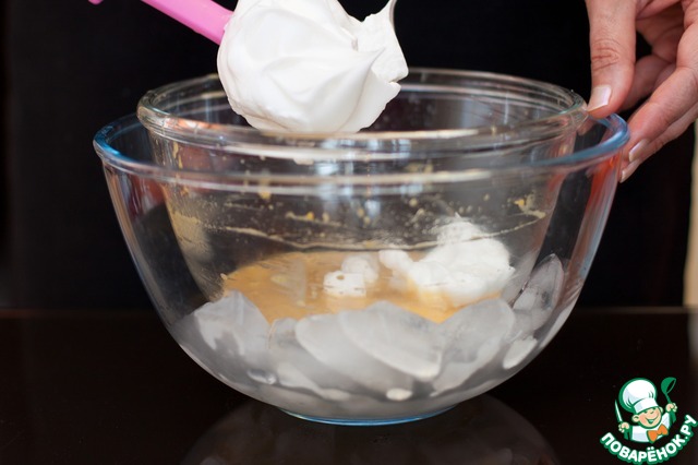 Вводить порциями взбитые белки в абрикосовую смесь, аккуратно перемешивая снизу вверх, стараясь сохранить воздух в белках.