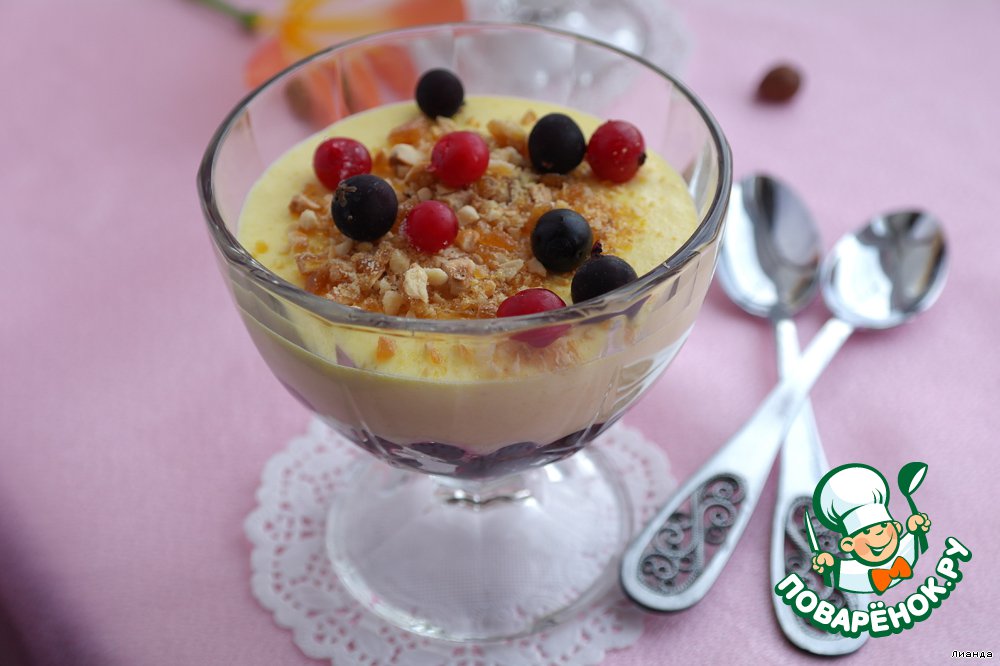 Разложить мусс в креманки поверх черной смородины. Поставить в холодильник для застывания.