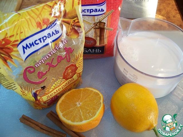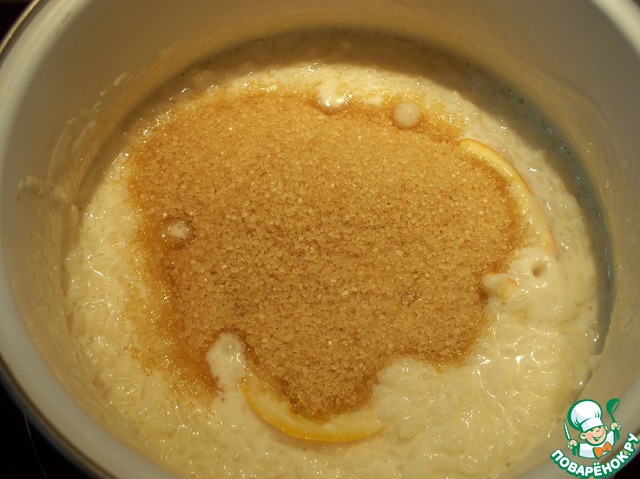 Молоко нужно вскипятить. К рису добавляем разрезанный апельсин и лимон, корицу, заливаем кипящим молоком и варим в течение 25 минут.