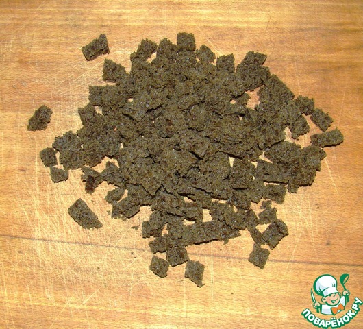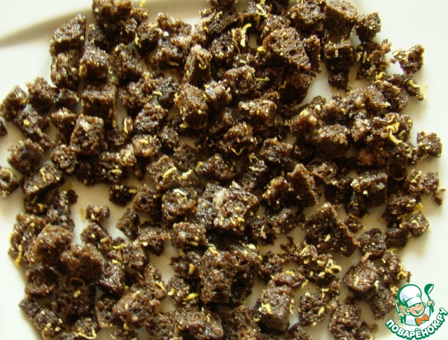 Хлеб нарезать крупными кусками и обрезать корки. Порубить ножом до крупных крошек.