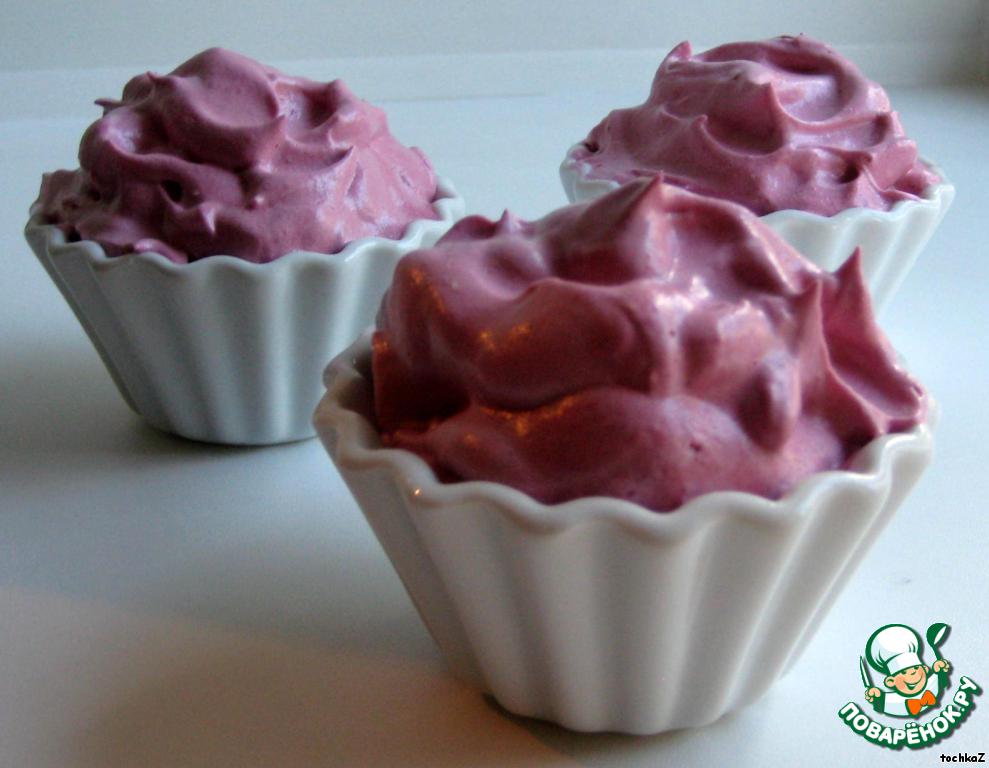 Охлажденное ягодное пюре соединить со взбитыми белками. Я выкладывала порциями, продолжая работать миксером (ничего не оседает и не разжижается).