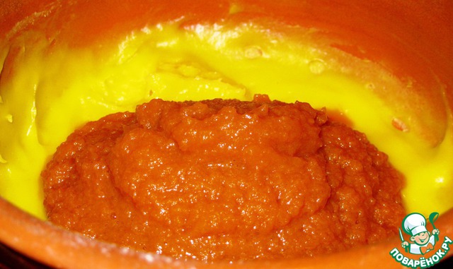 Подогрейте крем на медленном огне до загустения, постоянно помешивая. Пюрируйте тыкву и добавьте к крему. Тщательно размешайте.