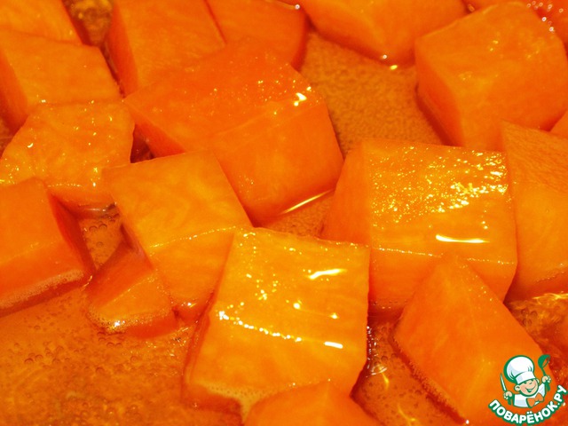 Необходимо очистить тыкву и нарезать ее на небольшие кусочки. Добавьте в тыкву ложку сахара, вино и протушите в течение 15-20 минут до готовности.