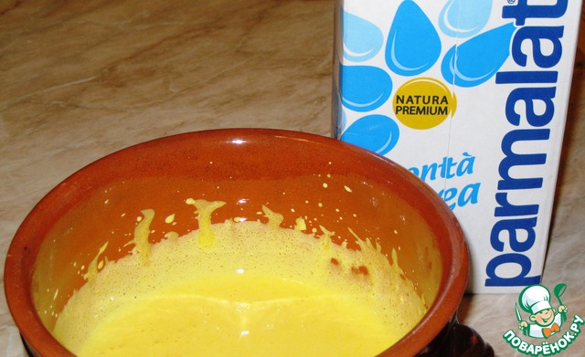 Тем временем смешайте желтки с оставшимся сахаром и взбейте смесь до кремообразной и немного воздушной консистенции. Понемногу подсыпьте муку, хорошо размешивая и не допуская образования комочков.