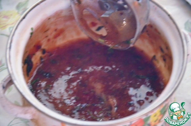 Снять клубнику с огня, добавить нарезанную кинзу и пюрировать с помощью блендера. Добавить клубничный сок и перемешать.
