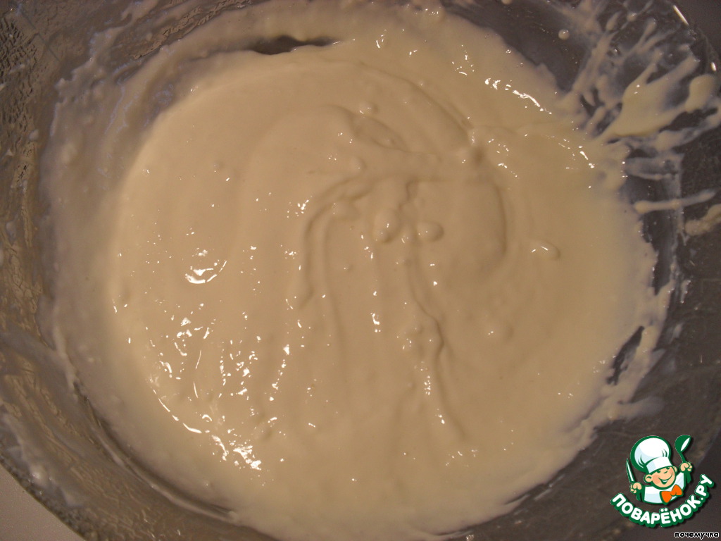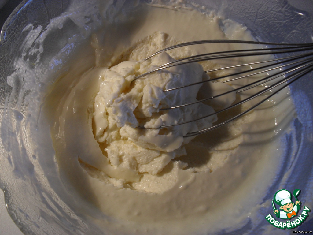 Достала желированную готовую сметанную массу и сначала соединила со сливками, а потом с белком.