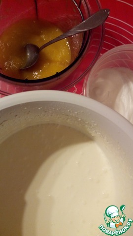 Начинаем священнодействие! В сливки вводим манговое пюре и аккуратно перемешиваем. В 2 приема вводим в мангово-сливочную массу взбитый белок.