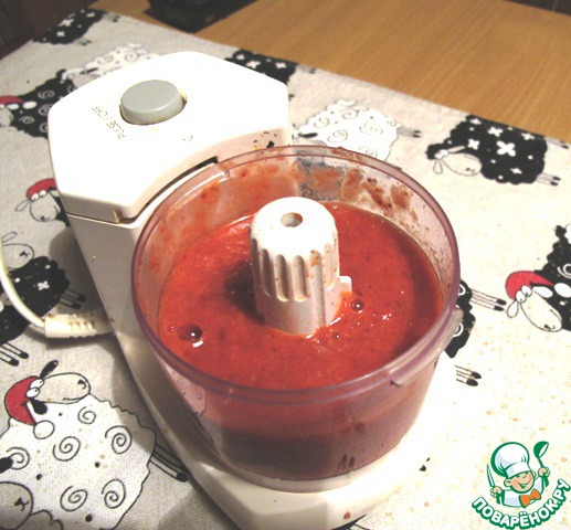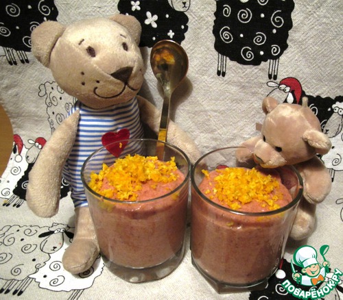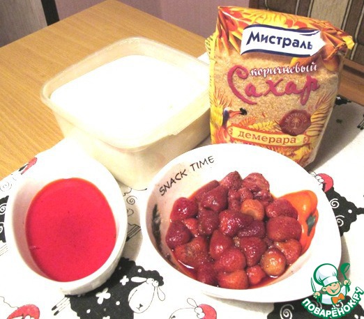 К клубничному соку добавляем воду, кипятим и, непрерывно помешивая, засыпаем манку. Варим до загустения. Добавляем клубничное пюре и ставим немного остудиться.