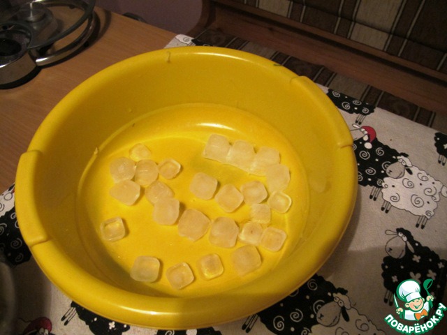 Переливаем в миску, в которой будем взбивать десерт. Берем емкость большего размера и насыпаем туда немного льда или наливаем холодную воду.