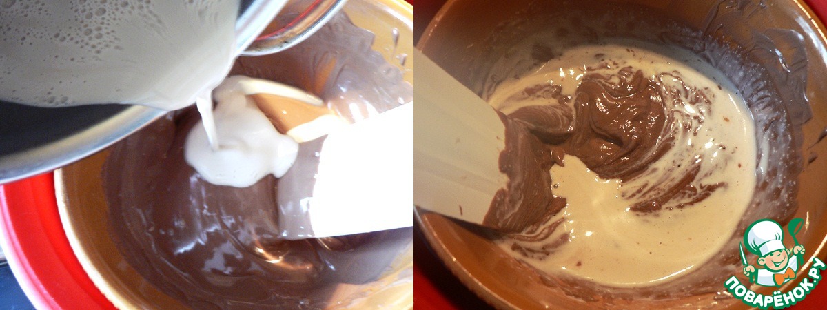 В растопленный шоколад влить сливки, тщательно перемешивая. Снять шоколадную массу с паровой бани.