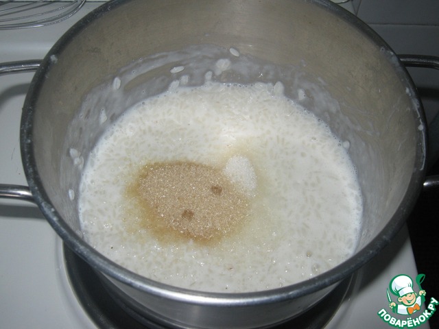 Вскипятить молоко со 125 мл воды. Добавить рис и томить 15 минут. Добавить 10 г коричневого сахара, ванильный сахар и 3 ст. л. сливок.