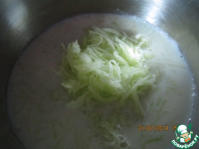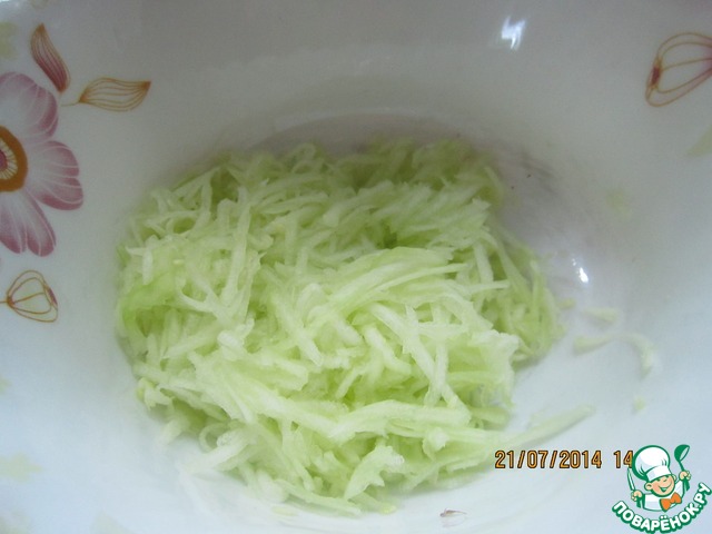 Молодой кабачок очистить, натереть на крупной терке. Отставить.