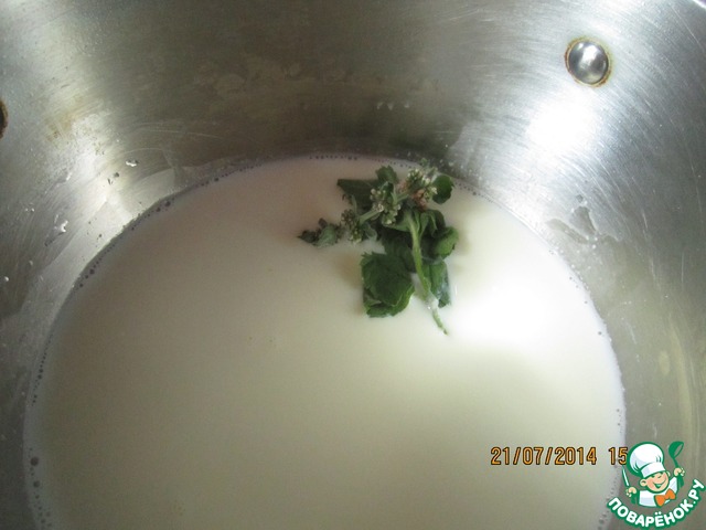 Процедить получившуюся смесь. Кабачок с кокосовой стружкой выложить в отдельную чашку. Рисовый или картофельный крахмал развести в половине стакана холодного молока или воды. Молоко (отцеженное от кабачка) довести до кипения, добавить разведенный крахмал и веточку мяты, сахар. Варить до загустения киселя. Выключить.