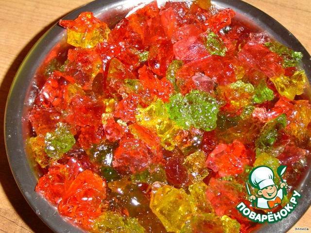 Для начала готовим желе,как указано на упаковке,только берем меньше воды,чем в инструкции.Можно сделать желе самостоятельно(1-2 ст.ложки желатина на 2 стакана сока).Разливаем его по формам и оставляем его в холодильнике на ночь.