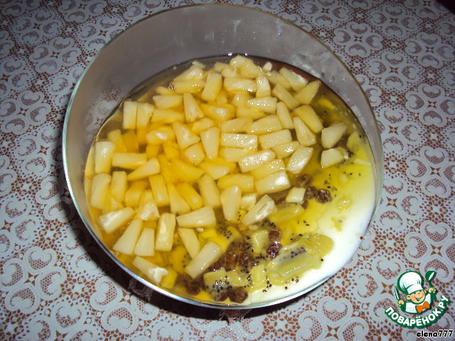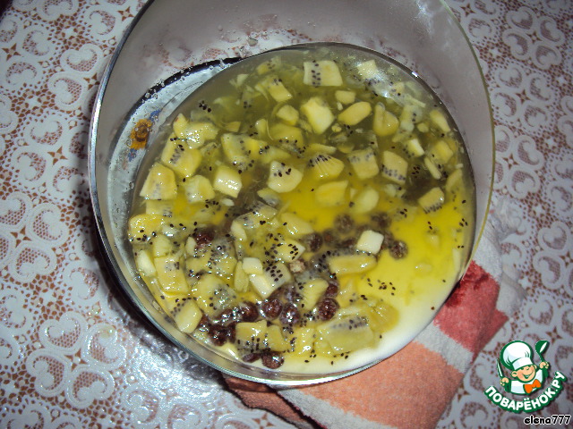 В чашку с кусочками ананасов влить ананасовый сироп, добавить 1/4 часть растворённого желатина, перемешать.