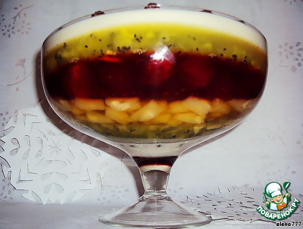 | Этот новогодний десерт - настоящий фейерверк вкуса! Разноцветное желе с кусочками фруктов и нежное ароматное желе из сгущeнки с шоколадными шариками делают это лакомство необычайно вкусным и по-новогоднему ярким и красочным! |