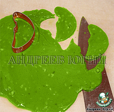 Оставшиеся 50 г. шоколада растопить в микроволновой печи, добавить зелёный пищевой краситель, тщательно перемешать. Вылить шоколад на бумагу для выпекания. При помощи широкого ножа распределить шоколад ровным слоем, дать остыть.