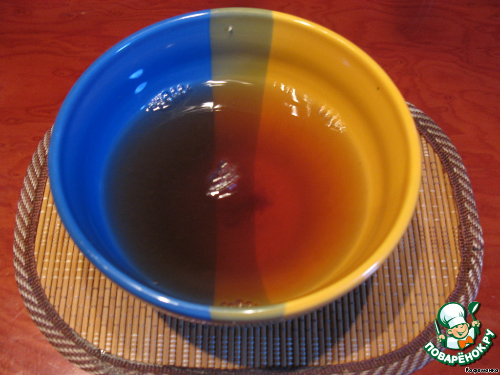 Для начала распустим желатин. Для этого зальем сухой порошок кипяченой водой и тщательно его размешаем. Я хотела сделать как лучше и добавила пару ложек клубничного сиропа (остался от открытой банки варенья). Оказалось, процедура вовсе напрасная - цвета не прибавилось! ;-)