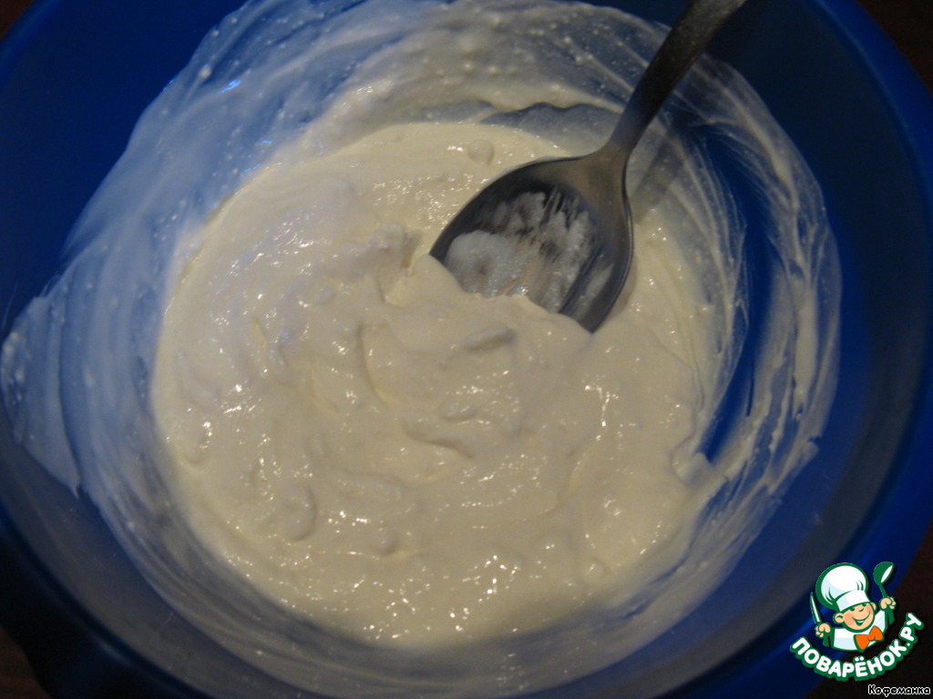 Теперь нужно растереть творог со сметаной и сахаром. Конечно, если Вы не приемлите комочки творога в готовом десерте, то можете добиться однородности. Я же не стала на этом зацикливаться. :-[