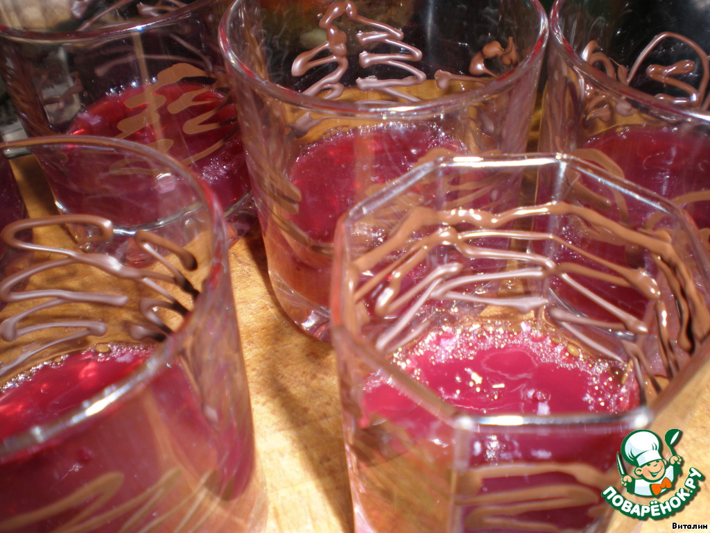 Делаю кулечек, плитку шоколада растапливаю в микроволновке и рисую по краю стаканов тоненько, разные узоры, но после того, как затвердеет желе