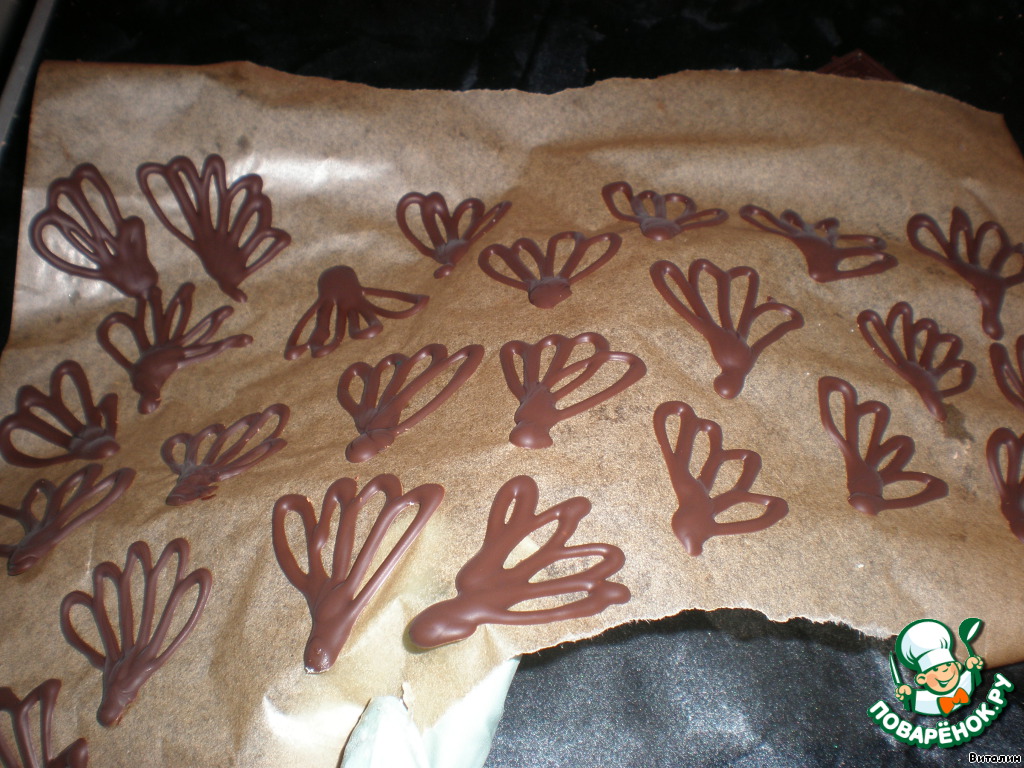 Выстилаю пергамент и этим кулечком рисую вот такие узоры, и в холодильник на 10 минут, для украшения