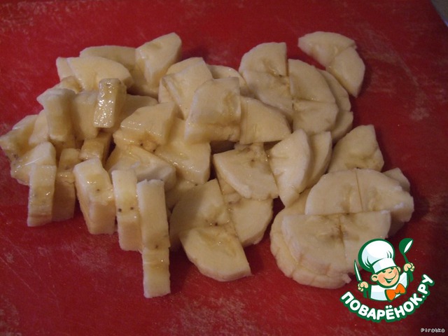 Теперь наполняем кожуру банана самим бананом, точнее, кусочками банана.