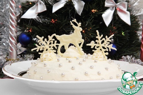 Выберете рисунки снежинки и оленя в интернете, распечатайте на листе ( я сделала 4 снежинки и 3 оленя для подстраховки, вдруг, при снятии с бумаги шоколадной фигурки, какой-то фрагмент отломается). Лист с рисунками положите на картон, сверху - лист бумаги для выпечки. Растопите шоколад в МКВ, переложите в полиэтиленовый мешочек, отрежьте край мешочка и выдавливайте шоколад по контуру рисунков, положите в холодильник для застывания. Шоколад возьмите с содержанием какао-продуктов не менее 45%, если взять с меньшим количеством, то готовые фигурки через 15 минут начнут таять, в этом случае поставьте фигурки на десерт перед самым выносом на праздничный стол.