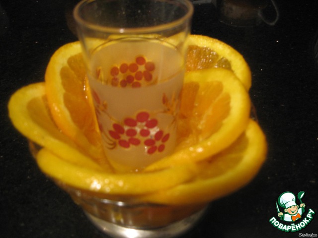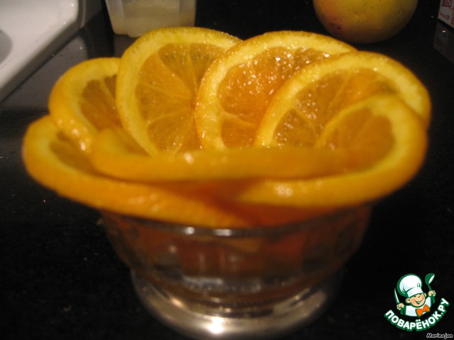 Каждый апельсиновый кружочек обмакнуть в разведенном желе.