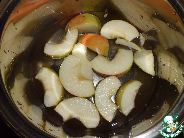 Нарезаем яблоко на кусочки, добавляем воду, ставим на плиту. Доводим до кипения. Варим буквально пару минут и отставляем немного остудиться.