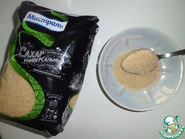 Процеживаем наш компот, добавляем сахар "Мистраль", размешиваем до растворения.