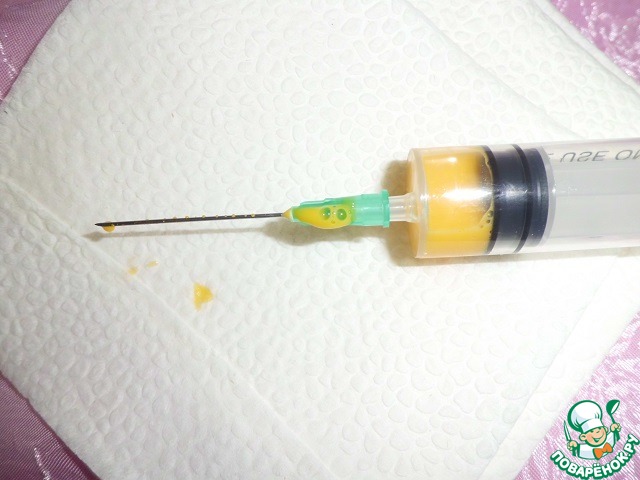 Берем шприц и наполняем его одним из красителей. Не наполняйте все сразу!! Масса будет застывать и вы ничего не успеете сделать.