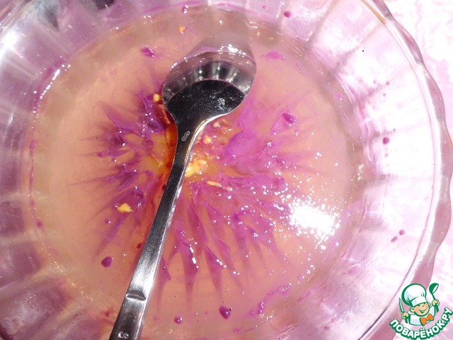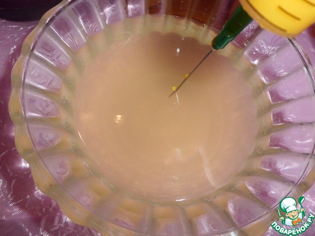 В отдельной емкости смешиваем три столовых ложки теплой воды и насыпаем туда немного желатина, размешиваем до полного растворения. Если ваш желатин требовал предварительного замачивания, то от той общей массы и возьмите эти три ложки.